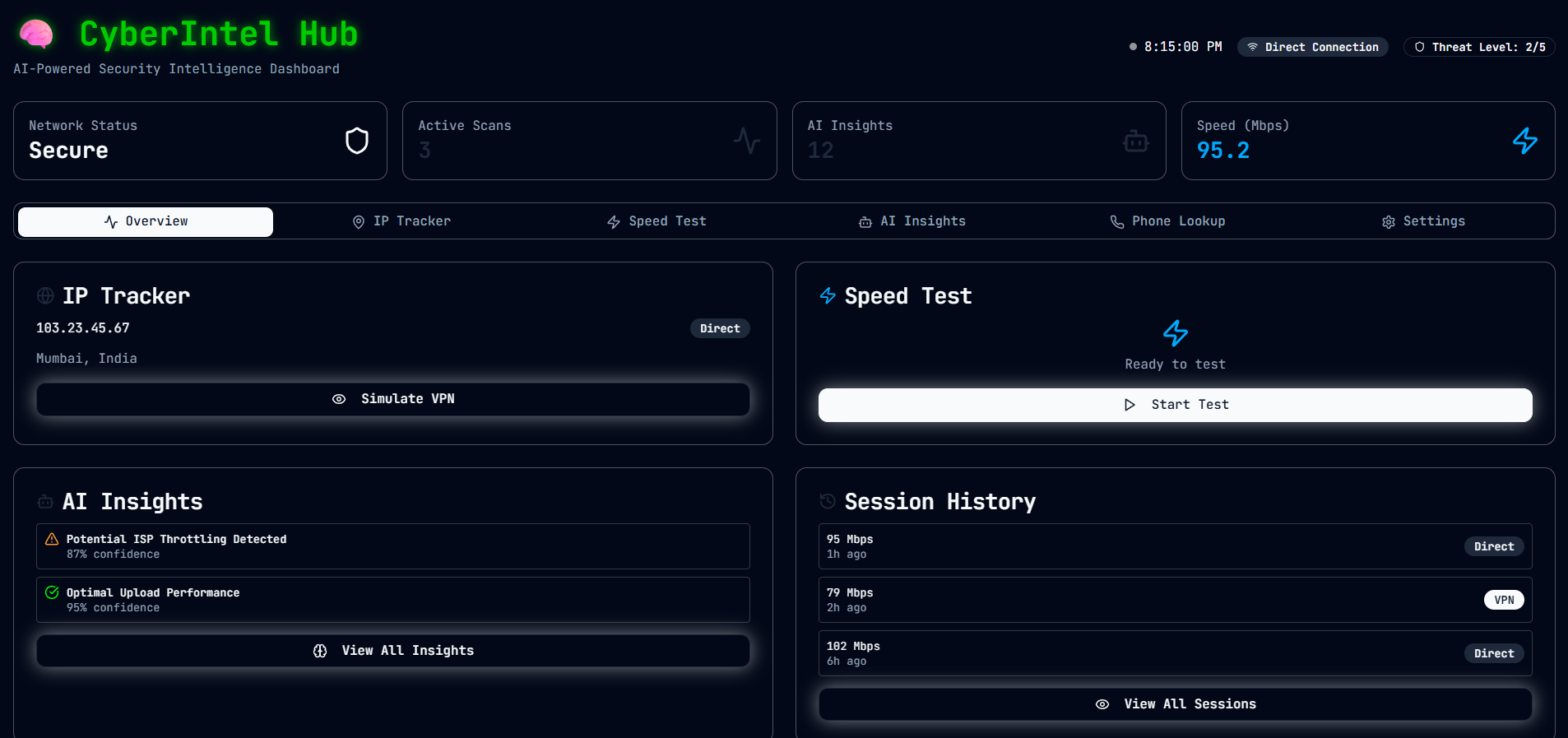 diagnostics, AI-enhanced insights, behavioral attack detection, VPN/IP monitoring & speed