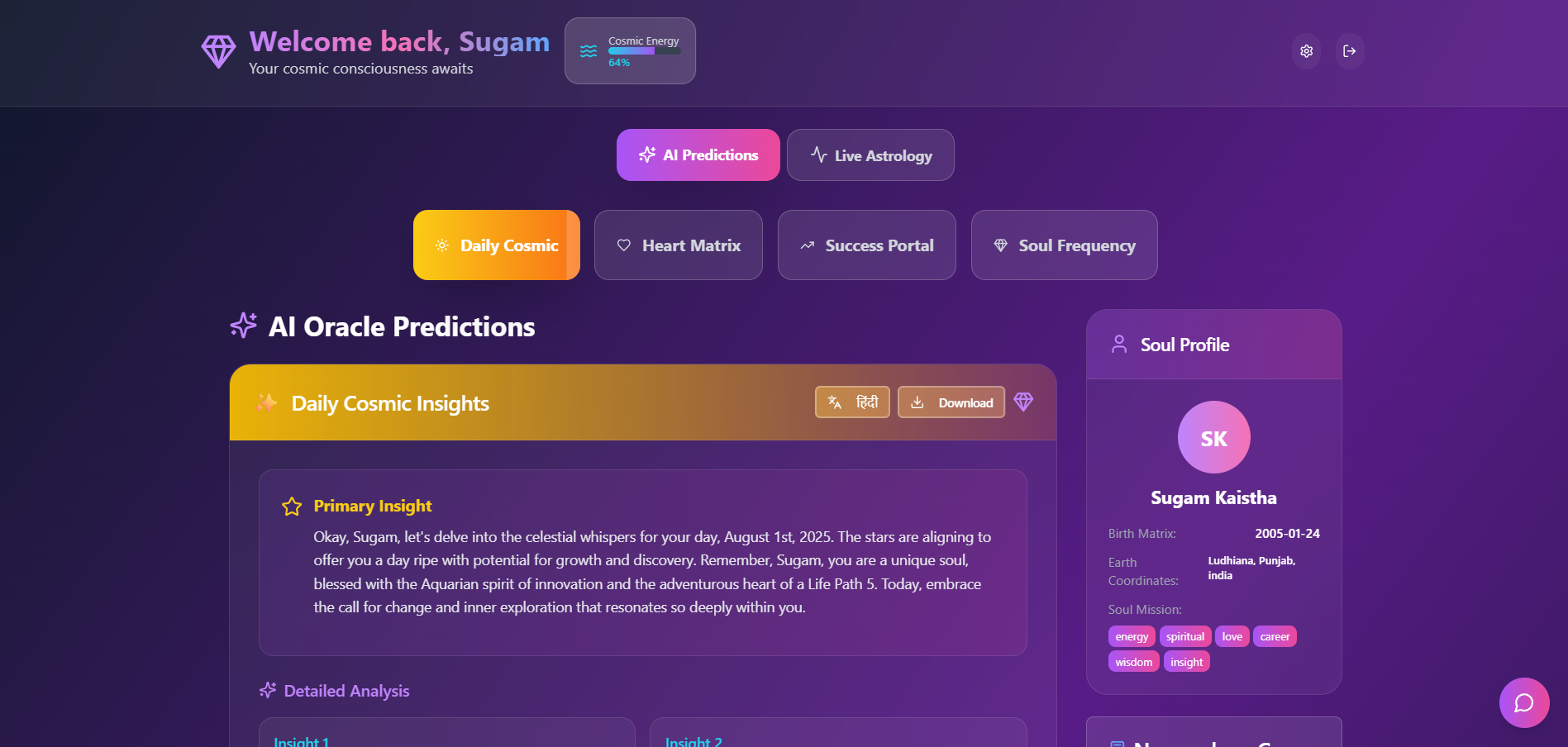 and numerology predictions using AI and Vedic principles. Just enter your birth details or name, and